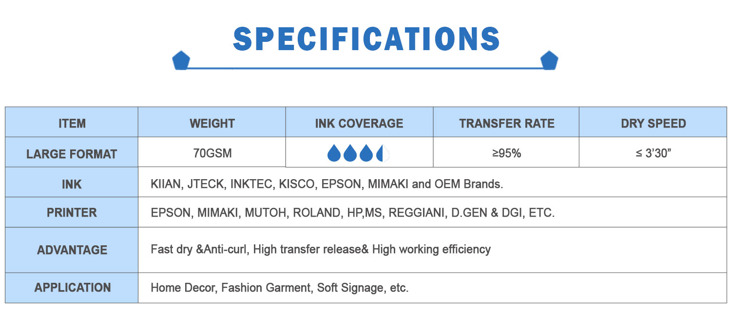 --Suit for large format printer --High and even transfer rate --Smoothly printing and transferring --Fast dry